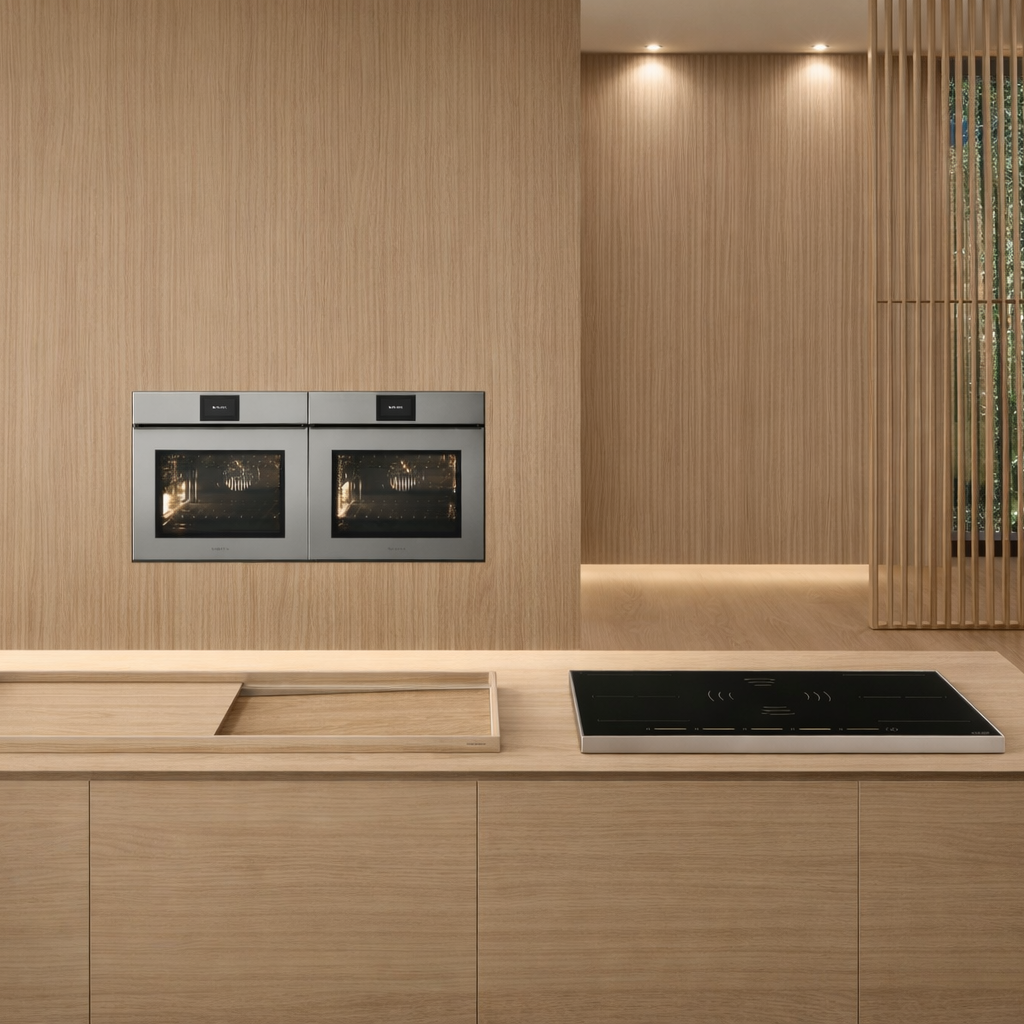 This minimalist modern kitchen features elegant light oak wood cabinetry with a seamless, handle-less design that creates a clean and sophisticated atmosphere. The full wall wood paneling enhances warmth and continuity, while the Barazza integrated built-in ovens and sleek black induction cooktop add a refined contemporary touch.